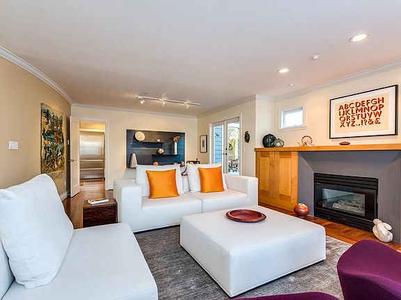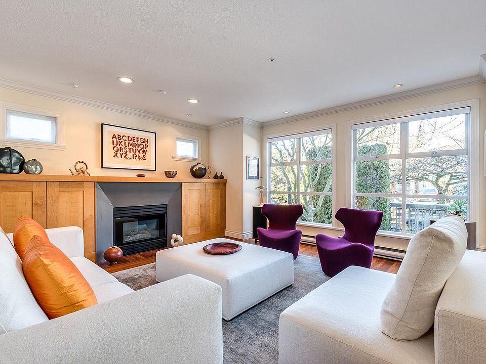 Prime Kitsilano location! Meticulously maintained and updated, this 5 bed, 3.5 bath, 1/2 duplex home boasts just over 2500sf and feels like a single-family home with a private, north-facing front yard surrounded by mature gardens. The generous-sized main floor offers a formal living room with custom maple built-in cabinetry and Brazilian rosewood floors; gas fireplace; kitchen w/updated appliances and access to sun-drenched outdoor dining deck. Upstairs offers 3 beds and 2 newly-renovated bathrooms. The spacious primary bedroom has vaulted ceilings; a spa-like ensuite bath with skylight for plenty of natural light. Downstairs offers 2 add'I beds + 1 bath, laundry and access to shared garage w/2 parking spots and private storage room. This home has been well cared-for by long-time owners.