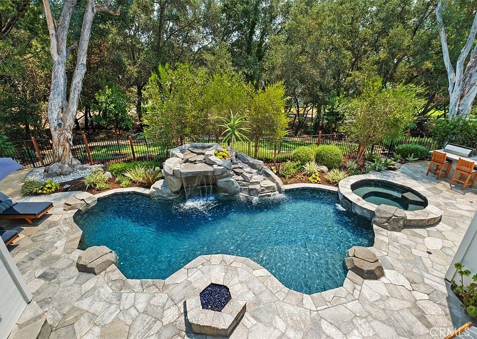 Step outside to your own private oasis, where you’ll find a sparkling pool with cascading waterfall, spa, fire pit and a covered outdoor lounge designed for year-round enjoyment. The fully equipped outdoor kitchen includes a built-in BBQ, refrigerator, sink, and ample counter space—perfect for hosting gatherings or enjoying al fresco meals with family and friends. Multiple seating areas, lush landscaping, Sonos sound system and ambient lighting create a resort-like atmosphere ideal for both entertaining and relaxation. Beyond the private yard, an additional 2,000 square feet of open, grassy space along with a tranquil wooded backdrop—creates a seamless extension of the property. Owned by the HOA, this rare outdoor setting enhances the home’s sense of space, privacy, and natural beauty. Together, it offers the look and feel of a nearly 10,000 square foot lot—ideal for outdoor living, entertaining, and everyday enjoyment.