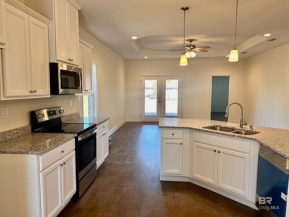 The Grayson plan combines open spaces and cozy family living with no wasted space. The kitchen features granite counter tops, stainless steel GE appliances, pantry, plenty of cabinet and counter top space, and is open to the living room. The living room highlights a raised octagon ceiling, and French Doors leading to a rear covered porch. The primary suite includes a full bath with a huge walk-in closet, oversized soaking tub, separate shower with glass door, and dual vanity. You will also find 9’ ceiling throughout, wood flooring throughout main living area, ceramic tile in bathrooms, utility room, and carpet in bedrooms. 4-sided brick to ground construction, fully sodded lawn, double garage with automatic door opener, fiberglass wood grain front door, and much more! This home is Gold Fortified.