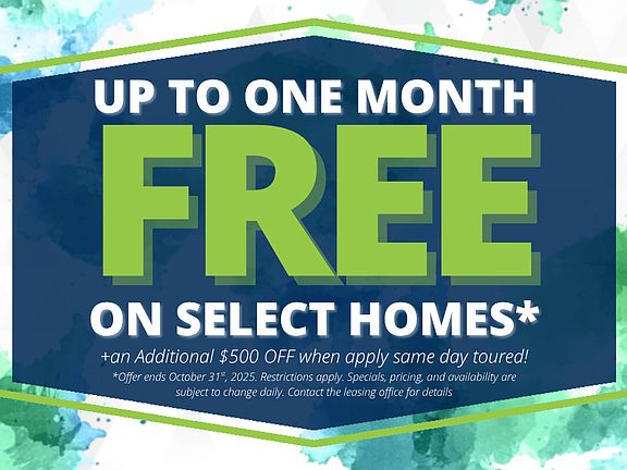 - Special offer! Up to One Month Free on select homes! +an Additional $500 OFF when apply same day toured! *Offer ends October 31st, 2025. Restrictions apply. Specials, pricing, and availability are subject to change daily. Contact the leasing office for details