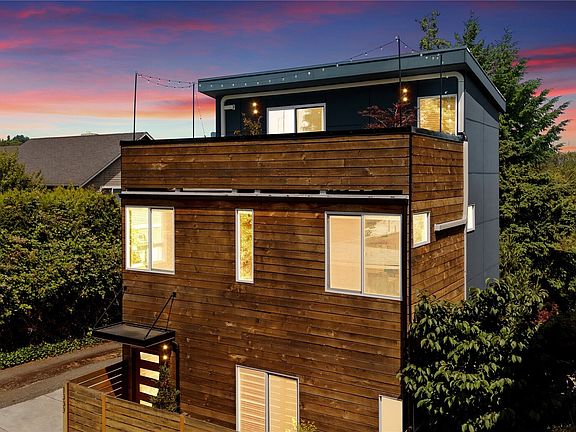 Design-forward and FULLY DETACHED, this 2-bed + flex-space home blends reclaimed Seattle wood, soaring ceilings, and thoughtful details, including air conditioning and heat throughout. The rooftop deck, complete with gas hookups for grilling and a fire pit, offers sweeping views of downtown Seattle. A professionally designed landscape wraps the home with over a dozen unique tree species. Includes OFF-STREET, DEDICATED PARKING, natural gas, and a tankless water heater. Sellers are OFFERING A CREDIT! Ideally located near both light rail lines, parks, and Beacon Hill cafés, this home offers elevated urban living with warmth and soul. Welcome home!