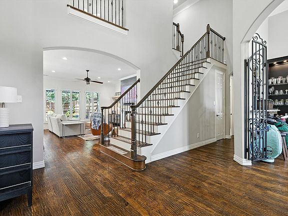 Welcome to 2354 Clearspring Drive N, located in the highly sought-after gated community of Hackberry Creek. This beautifully updated 4 bed, 3 bath home sits on a premium corner lot with circle drive, striking brick and stone exterior, and lush, professional landscaping. Step inside to a light-filled foyer that offers a direct view to the backyard retreat. The formal dining room, wrapped in custom wallpaper, complements a front flex room currently styled as a wine lounge, with views into the kitchen and front yard. The chef’s kitchen features custom cabinetry, a large quartz island with bar seating, marble backsplash, stainless steel appliances, and designer lighting - all flowing seamlessly into the living and breakfast areas with backyard views. The living room centers around a custom gas fireplace with built-in shelving. A private guest suite and remodeled full bath are located downstairs. Upstairs, the spacious primary suite overlooks the pool and boasts a spa-like bath with slate floors, rain shower, jetted tub, dual vanities, and walk-in closet. Two additional bedrooms, a shared bath with separate vanities, and a game room with built-ins complete the second level. The outdoor space is a true retreat, featuring a built-in kitchen with granite counters, bar seating, propane grill, refrigerator, and drawers. A custom motorized louvered pergola with dual ceiling fans and heaters offers adjustable shade and comfort year-round. The resurfaced, heated pool with spa and water feature is bordered by flagstone and Carvestone decking - perfect for entertaining. Additional highlights include an oversized garage with epoxy flooring and bonus storage, plantation shutters throughout, and a downstairs utility room with sink. Hackberry Creek offers three private parks, neighborhood events, and quick access to Hwy's 114, 635, and 161. The community is also within Coppell ISD’s limited open enrollment program. Refined, functional, and move-in ready—this home is not to be missed!