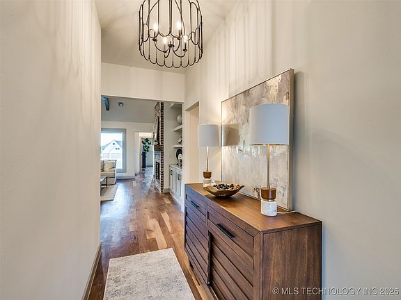 Move-in ready in Bixby's Harvard Oaks packed full of gorgeous finishes and attention to detail. Full brick exterior with a covered front and back porch. Rich hardwood floors throughout the main level, designer lighting, and custom wall finishes. The open great room features vaulted scissor-truss beam ceilings and large picture windows for beautiful natural light. Cozy brick fireplace flanked by built-ins. The beautiful and functional kitchen has a large center island, gas range, abundant counter space, and a large walk-in pantry. Garage entry drop-zone. Primary suite and a second bedroom with ensuite bathroom on the main floor; a large game room, two bedrooms, and a full bathroom with double sinks located upstairs. Harvard Oaks is just a mile from the Bixby West campus; amenities include a serne walking trail, community pond, pool & clubhouse (coming soon).
