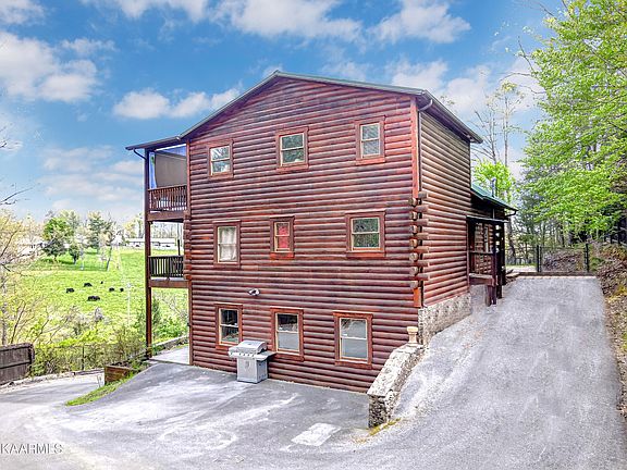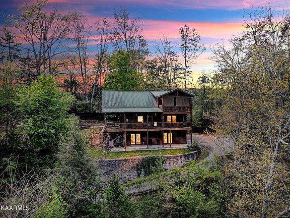 Seller is very motivated. Bring your offer! This luxurious log cabin & the adjacent lot sits on 1.2 acres of land and is conveniently located just minutes from downtown Pigeon Forge. Featuring a stunning open main living area with a soaring cathedral ceiling and a wall of windows that offer breathtaking views, this cabin is a true retreat from the hustle and bustle of everyday life. With hardwood flooring and tongue and groove ceilings throughout, the cabin exudes a warm and inviting atmosphere. The main level master suite and two additional bedrooms provide plenty of space for family and guests, while the walk-out basement includes a large rec room and direct access to the covered patio. Relax on the covered wraparound deck or custom-built stone patio, perfect for a quiet evening by the firepit. Whether you're looking for a primary home or your personal seasonal getaway, this cabin is sure to impress. **Due to regulations/zoning property does not qualify for Short Term Rental permitting **