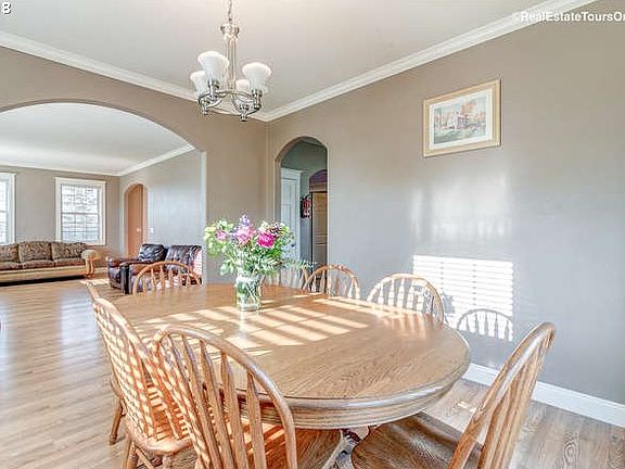 5 Bedroom, 3 Bathroom home on 6.89 acres. NEW 28 x 36 pole barn W/concrete slab floor, fruit trees, raised garden beds, play structure & lovely territorial views. Interior features include 9' ceilings on both levels, built-in wood burning fireplace, crown molding, jetted tubs in both master and secondary bathroom. Main Floor master bedroom with full bathroom. Large back deck overlooking pasture. 12x36 barn and cross fencing for animals.