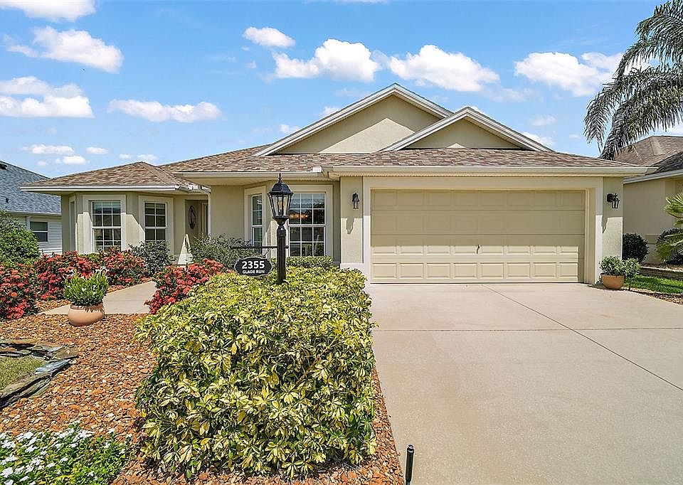 WOW!-->> $20K PRICE IMPROVEMENT! MOVE-IN READY AND PACKED WITH UPGRADES YOU WILL LOVE! PRICED TO SELL! Welcome to this beautifully maintained Designer Jasmine model—a Concrete Block & Stucco 3/2 with a large 2-car garage, PRIVACY and GLASS ENCLOSED LANAI featuring a mini-split HVAC system for year-round comfort and added living space! Major Updates Include: NEW ROOF (2023) with dual solar attic fans; NEW HVAC (2025); NEW Water Heater & Whole-House Water Filtration (2024); NEW Irrigation Panel, Garage Door System & Clothes Dryer (2024); SECO Surge Protector & Solar Tubes (x3); Inside, enjoy high vaulted ceilings, CROWN molding, and hickory cabinetry in the kitchen, baths & INDOOR LAUNDRY ROOM. The kitchen features a pantry, pull-outs, under-cabinet lighting, tile backsplash, and a breakfast nook with chair rail detail. The front guest room doubles as a home office or hobby space with a built-in desk, storage cabinetry, and Murphy bed. Additional highlights include: updated flooring; wood cornices & Bali shades; "Race Deck" garage flooring & pull-down attic stairs; solar blinds in the lanai; gutters & downspouts; hideaway screen door & upgraded entry door, upgraded landscape along with field stone slate wall & More! Prime Location! Nestled between Lake Sumter Landing and Brownwood Paddock Square, close to Colony Plaza, Havana Country Club, and a variety of recreation, shopping, and dining options. Don’t miss this one—it’s the whole package of comfort, style, and convenience in The Villages®!