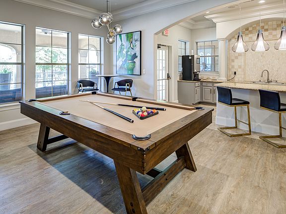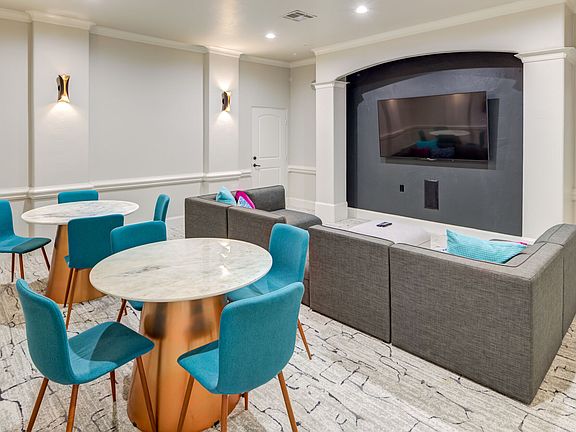 - Exterior features: Built-in computer desks with under-shelf lighting, Business Center, DR - Plank (Wet+Dining), Double-sized glass showers, Elegant accents include crown molding, Game Room, Heating: Gas, Package Receiving, Parking Available, Pet Park, Theater