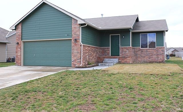 Fabulous home on huge corner lot in Turkey Creek. Several upgrades and modifications to this popular floor plan that you are going to love. Garage entry to home is located near kitchen, with main floor laundry. Master bedroom has coffer ceiling with an expanded master bath to include walk in closet, raised double sink and vanity, Jacuzzi whirlpool tub with block window, and full shower with slide doors. TV in master bath stays. Bedrooms are wired for ceiling fans and all light fixtures use energy efficient LED or compact florescent bulbs and additional outlets are included throughout the home. Living, kitchen and dining rooms have a vaulted ceiling. Kitchen has high end whirlpool stainless steel appliances, eating bar, lots of cabinets with roll out drawers and tile backsplash. Don't miss the concrete safe room with lighting and built in shelving located in the basement family room. It has an exterior steel door with dead bolt lock. There is a stainless steel bar in basement. Slider door in dining to access back yard. Lot is approximately 1/3 acre. Fire hydrant is located on your lot and reduces hazard insurance. Siding is upgraded to concrete Hardie Board Siding. Property line is 16ft wide on south side and much larger on north side if you want driving access on either side. A future exterior door in the garage is roughed in and all walls in garage have electrical outlets. All exterior walls have outlets on outside and home is upgraded to 200 amp service. Hot water tank is upgraded to 50 gallons. Soil was treated for termites during build in 2012. Security system is owned by Vivint and can stay if buyer activates the service. Turkey Creek is in the Goddard school district and has a neighborhood lake.