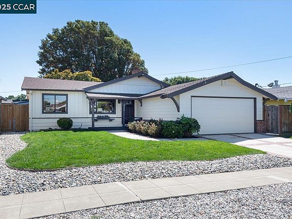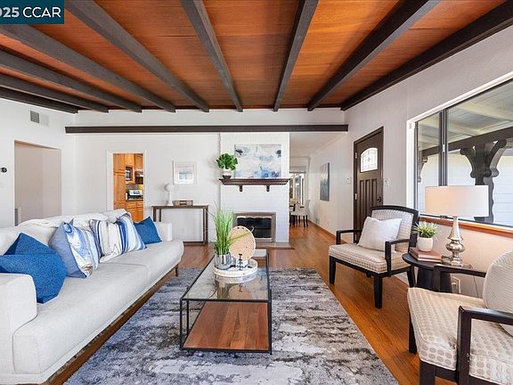 A California Contemporary with timeless appeal—step inside to vaulted ceilings with exposed beams, a welcoming fireplace, and rich wood floors for a warm first impression. A formal dining room flows into a spacious addition linked to the living room by elegant French doors for easy, natural flow. This versatile room—ideal as a family or TV room or den—opens through sliding doors to a newly rebuilt, oversized wood deck, perfect for outdoor dining and relaxed evenings. The eat-in kitchen features maple cabinets and granite countertops. The primary suite offers a glass-enclosed step-in shower, updated vanity, and fresh flooring, while the hall bath has a full tub with ceiling-height tile surround and an updated vanity. Comfort perks include central A/C, ceiling fans, and an alarm system with sensor lights. A large garage has laundry, built-in cabinets, two workbenches, and a newer garage door motor. Outdoors, enjoy a covered side patio, raised planters, and a custom wood shed. Freshly painted inside and lovingly maintained, this home exudes warmth and everyday comfort. Convenient to Highways 880 and 92, shopping, dining, Bay Area airports, Mt. Eden Park, and Chabot College.