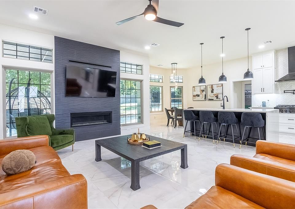 Exceptional professional entire home remodel sits on 1.25 acres mol so you can spread out while being close to major highways. Completely surrounded by pipe and cable fencing there is plenty of room for entertaining on the extended patio or volleyball on the sand court or even work out or tinker in the 410' outdoor building complete with a mini split. The recently installed french drains take the torrential rains away from the house. Inside welcomes you with porcelain tile throughout and an open floor plan. The office could be a 5th bedroom with the closet with built-in drawers. The spacious living with an abundance of natural light from the wall of windows and the dining area is open to the eat-in kitchen with seating at the expansive bar. Built-in oven, microwave, vent hood and stove is complete with a pot filler & walk-in pantry. The dining area has a built-in bar with wine refrigerator. The first spacious primary suite with a wing of it's own has a spa like ensuite with fog-free mirrors, a soaking tub, walk-in shower, double sinks and a beautiful walk-in closet with tons of storage. On the other side of the house is a 2nd primary with ensuite with double vanities, walk-in , shower & closet plus a soaking tub. The 2 secondary bedrooms both have walk-in closets with dressers and are connected by a Jack-N-Jill bath with double vanities and kick lighting. This exceptional home also has a tankless hot water heater, 4 outside ranch faucets, a sprinkler system that sprinkles the entire acreage and a class 4 shingled roof replaced in 2023. The garage can fit 5-6 cars with a tandem arrangement plus is heated and cooled with it's own unit. Close to major highways leading to Oklahoma City, Norman, OU, hospitals, FAA, TAFB, shopping, entertainment and all the amenities surrounding cities have to offer. Schedule your personal showing today. This is a home you will not want to miss.