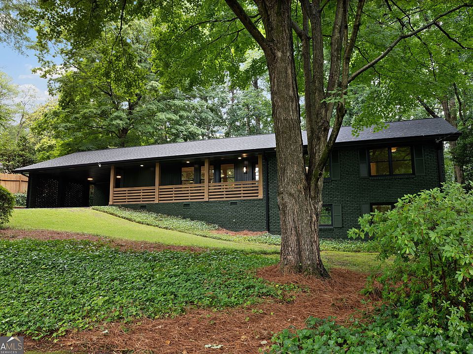 New price! Perched on a hill in the serene Sherbrooke Forest neighborhood of Atlanta, this fully renovated 4-bedroom, 3-full-bathroom ranch with a finished basement at 2356 Sherbrooke Drive offers modern luxury and timeless charm. The open-concept main level boasts vaulted ceilings, gleaming hardwood floors, and a stunning gourmet kitchen with an oversized island seating five, quartz countertops, a 36" gas range, built-in microwave, wet bar with space for beverage fridge, and marble backsplash. A light-filled, tiled sunroom overlooks the private, wooded backyard, perfect for relaxation, while a shiplap-accented laundry/mudroom with checkerboard tile adds style and function. The master suite features a spacious walk-in closet and a spa-like bathroom with dual vanities, a soaking tub, and a frameless glass shower with built-in lighting strip. The terrace level includes durable luxury vinyl flooring, a media room, a full bathroom, and an office/in-law suite with exterior patio access, ideal for guests or remote work. With a new A/C system, hot water heater, roof, and energy-efficient windows,, this home is move-in ready. A 2-car carport with an additional parking pad and a backyard storage shed complete the property. Located minutes from Buckhead, Midtown, and major highways (I-285 and US-78), this hilltop haven offers easy access to top-rated schools, shopping, and dining-don't miss this Atlanta gem!