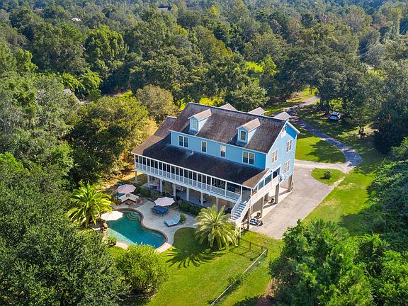 Absolutely stunning home on 2.4+/- acres on Bayou Portage with a pool! This home has an outdoor bar, lots of storage , great utility lift for groceries ! A beautiful view from just about every room! Come watch the sunset and enjoy the evening breeze from your screened in back porch! Jump in your boat and it is just about a 15 boat ride to the Gulf ! Come make your appointment to see this amazing property today!