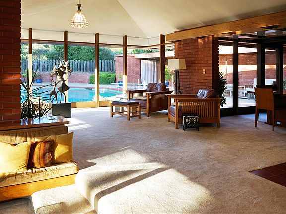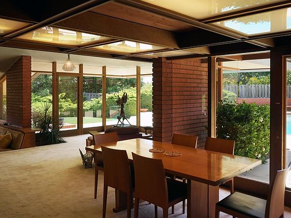 Fully furnished. It's listed as 3 bedrooms, but there are actually 4 bedrooms; one is currently set up as office with a custom corner teak workspace. There are 2 full bathrooms, and a powder room. An inviting comfortable sunken conversation pit has a large built in corner couch, creating opportunities to connect. The open living/dining area is furnished with an inlaid custom designed table. A beautifully designed angled pool reflects dancing sunlight on the living room ceiling. Plenty of built in bookshelves and cabinetry offer ample storage. Cozy radiant floor heating will warms your feet. Constructed primarily of old growth heart redwood and distinctive Wrightian brickwork, there's attention to every detail from mitered glass corner windows to the unique sliding glass clerestory windows. The master bathroom and bedroom open to a skylit private atrium, next to a large walk in closet. There are many built-ins, including plenty of built in bookshelves and cabinetry for sleek seamless storage.