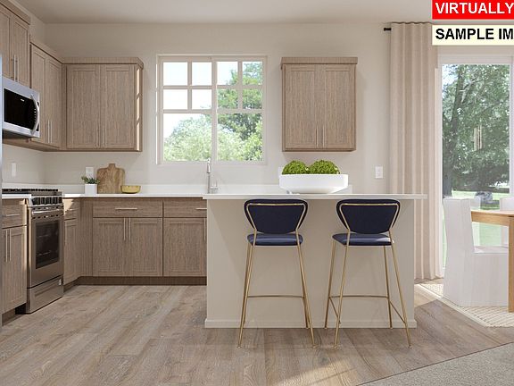 The Great Room, kitchen and dining room are situated among a convenient and contemporary open floorplan on the first level of this two-story home, while sliding glass doors lead to the patio. All three bedrooms are upstairs, including the luxe owner's suite which is comprised of a restful bedroom, en-suite bathroom and walk-in closet. Walk-in pantry in kitchen. This home includes a refrigerator, washer/dryer, central air, and window blinds! Renderings and sample photos are artist conceptions only. Photos are of similar or model home so features and finishes will vary. Estimated completion - February.