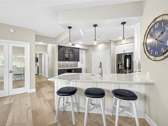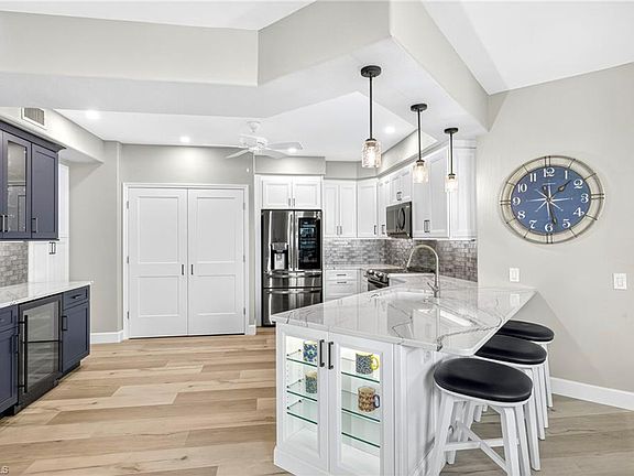 Stunning Renovated 1st-Floor Corner Unit in Spring Run at The Brooks – Sunset Stream Welcome to this beautifully reimagined 2-bedroom plus den residence, fully remodeled top-to-bottom with new finishes and thoughtful design. Overlooking the 8th green of Spring Run's coveted golf course, this home blends modern updates with a comfortable, move-in-ready feel. Inside, you will find quartz countertops, luxury vinyl plank flooring, modern new lighting, mirrors, hardware, and interior doors throughout. The kitchen is equipped with pull-outs in every cabinet including the pantry, LG dark stainless appliances and a built-in bar with wine fridge. The generous living space opens to a lanai with seamless screens and sweeping views of the 8th fairway—a serene backdrop for both relaxation and entertaining. This residence is offered turnkey with designer furnishings, blending style and comfort for a truly move-in-ready opportunity. Added peace of mind comes with a 2019 roof, 2021 impact windows, 2022 Hurricane rated front door with sidelight, 2025 HVAC with UV light and electrostatic filter, and all newer appliances. Beyond the home itself, Spring Run at The Brooks offers an enviable lifestyle with championship golf, vibrant social opportunities, clubhouse dining, tennis, bocce, and fitness amenities—all just minutes from fine dining, upscale shopping, and Gulf beaches. Optional memberships to The Commons Club offer access to private beach facilities, pickleball, dining, and more. Don’t miss this rare opportunity—schedule your private showing today!