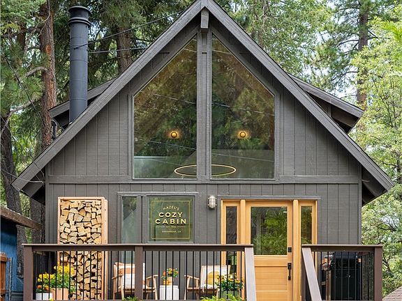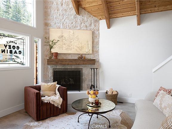 Welcome to Hazel’s Cozy Cabin! Imagine relaxing in an A-frame mountain cabin exquisitely designed and renovated by HGTV’s Jasmine Roth and featured on the cover of HGTV Magazine. Jasmine’s goal for the cabin was to create a getaway that felt like a sophisticated summer camp, a place where you can sit back, relax, and put your feet up. No expense was spared on this truly one-of-a-kind Arrowbear retreat. When you open the dutch door the large windows give a light and bright rustic feel to the open floor plan that connects the living room, dining room and kitchen. The original wood beamed vaulted ceilings contrast the luxury vinyl plank flooring that looks like polished concrete. The inviting floor to ceiling stone fireplace is a perfect place to nestle up with your favorite book or a glass of wine, or watch the Samsung Frame art tv. The dining room and kitchen flow together with the stone wall and smooth quartzite counters and custom cabinetry. The ILVE range and the panel ready Italian appliances are beautiful! The primary bedroom is just behind the kitchen with separate space that could be used as an office or nursery with vintage doors to separate. The upstairs loft with four queen sized bunk beds is a place for family and friends to stay, play and hangout. The brand-new composite front deck is perfect for hanging out and entertaining and the back deck is set up for the BBQ and engineered for a 6’X7’ hot tub if desired. You really have to come see this beautiful furnished, and completely turnkey cabin located by Arrowbear Lake and just minutes away from Snow Valley Mountain Resort.