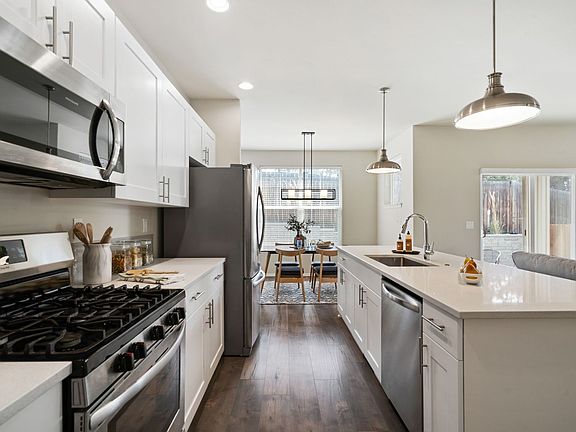 Downstairs has an open floor plan with a spacious kitchen boasting stainless steel appliances and a gas stove, half bathroom, spacious pantry, two car garage, and private patio. Continuing upstairs, you will find a large primary bedroom with a spacious closet and attached bathroom, laundry room with extra storage, and two additional bedrooms with another full bathroom.