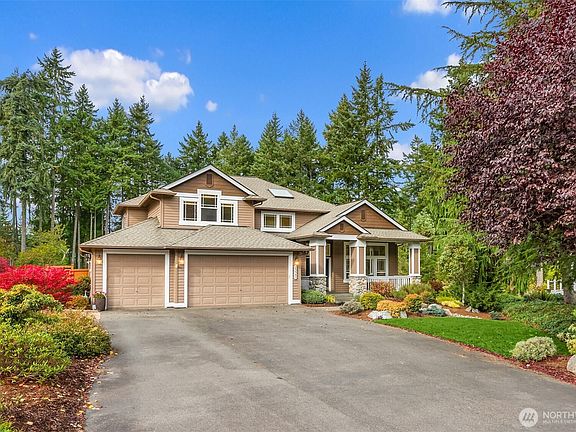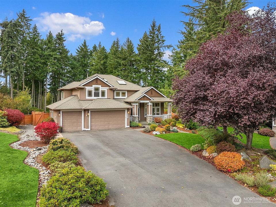 Tucked away in a quiet cul-de-sac in the desirable Woods & Meadows neighborhood, this warm, light-filled home is made for everyday comfort & easy entertaining. The spacious main floor flows naturally from the kitchen & eating area to a large deck overlooking the fully fenced .55 acre yard—ideal for garden lovers, play space, or summer gatherings. High ceilings, a cozy gas fireplace & multiple living areas (den, formal dining, living room) allow flexibility for connecting & unwinding. The generous primary suite includes an adjoining bonus room, the ideal office, studio, or private retreat. Two bonus rooms could alternate as a 4th bedroom. Roomy 3-car garage. This peach has space for everyone. Close to schools, downtown Poulsbo & Silverdale.