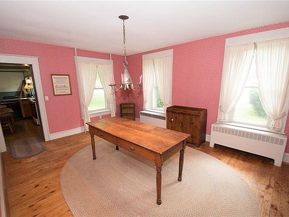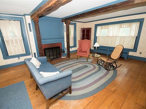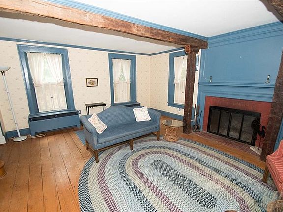 Classic Colonial Farmhouse! Has formal living room and family rooms, both with wood burning fireplaces and gorgeous wood beams in the living room. Modernized kitchen overlooking the family room, formal; dining room, wood floors throughout, old brick interior wall in the kitchen and a beautiful wood staircase. 1st floor bedroom/office/den and full bath, 1st floor laundry. Upstairs you will find more pegged wood floors, 3 good sized bedrooms and a HUGE full bathroom. Winding driveway to a private setting with a big size rear yard. Basement walks out through garage for convenience. Some sweat equity could really make this one shine!! Won't last at this incredible price!!!