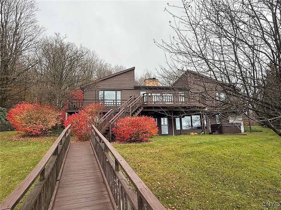 Located in the heart of CNY this serene property leaves you thinking you are in the Adirondacks without all the traveling. Located on 26.63 acres in the town of Homer (north end of Cortland County) this is a great retreat for relaxing, hunting and year round living. The drive in will have you relaxing and unwinding instantly as you navigate thru the woods. The home boasts a wrap around porch with stairs that walk down to the dock on the half acre plus pond stocked with bass. You can dangle your feet in the pond and enjoy the spectacular view! The tiled entry foyer has vaulted ceiling with skylight. The large kitchen has an island and quartz countertops. Kitchen opens to a large dining room with picture window view of the pond and morning sunrises. The living room has vaulted ceilings with floor to ceiling brick fireplace with Harman pellet stove insert. Living room also opens to the deck creating a great entertaining area. Down the hall there is an abundance of storage closets, a full bath and the first bedroom which is currently setup as quilting/craft room, more closets leading to the primary suite with full bath and walk-in closet. Back in the entry foyer there is a mudroom leading to the attached two car garage and spacious laundry room. The spiral stairs lead to the lower level family/in-law suite with living/dining/kitchen area that walks out to a hot tub. There are two more bedrooms, full bath and storage room. The utility room has workshop space and a 400 gallon holding tank for water. This wonderful property is nestled in nature has so much to offer. Great opportunity to have a farmette complete with chickens and horses. Square footage in Real Property (1904 sq) is not accurate. Per owner is is basically double that at 3808 sq. The lower level has been finished with door and window egress. WIFI and internet are available.