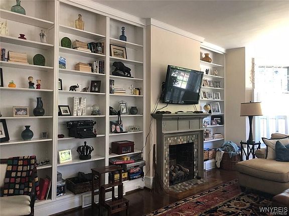 This beautiful late Victorian, located in the Elmwood Village, has 4 BR, 3.5 baths and features hardwood floors throughout. The grand Entry Hall boasts a handsome, decorative fireplace. The Living Room includes extensive built-in shelving, abundant natural light, and ornamental fireplace. The spacious Formal Dining Room also boasts a deep 'window seat' for display. A Half Bath is conveniently located nearby. The updated Kitchen includes a large Butler's Pantry, wine cooler, and stainless appliances. Sliding glass doors open to a large, terraced deck. The serpentine staircase leads upstairs to 4 Bedrooms. The Primary Bedroom includes an en-suite Bathroom. Two other Bedrooms share a full Hall Bathroom. The 4th Bedroom also has a private Bathroom. The Attic is available for storage. Laundry is located in the Basement. Outside, the 2 car garage adds convenience to this lovely home. No smoking.