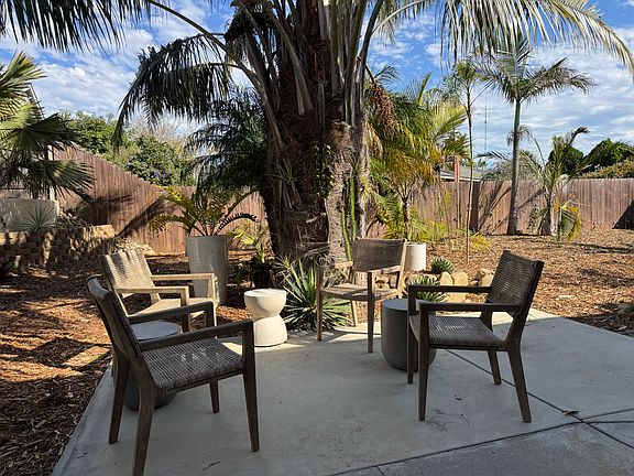 Outside you'll have access to a large fenced yard with a variety of palm trees that feels like a tropical oasis.