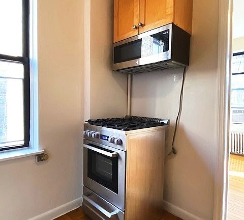 SUNNY! There are solid stainless steel appliances, New Electric Stove, , mounted microwave, quality wood cabinets, hardwood floors, and high ceilings. Both bedrooms fit Queen beds. ALL Rooms have WINDOWS, including the kitchen and bath. Clean building with great staff! The kitchen area is the common space There is no separate living room. There is enough room to put a couch in the common area (see the table in the pic).