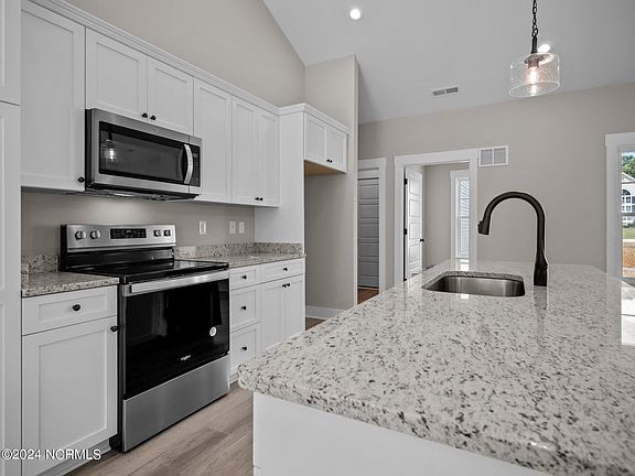 **The builder is offering $5,000 to use-as-you-choose** Welcome to the all new Granby in the waterfront community Kingsbridge II. With over 2200 heated square feet, this home features some of the best upgrades around! Loaded from top to bottom with fine details, this home has a great living room, large kitchen with a breakfast area, and 3 large bedrooms, an office, and a bonus room. You'll be sure to be impressed with the LVP flooring, beautiful granite countertops, custom cabinetry, recessed lighting, and crown molding. You won't be left wanting more with this home on your list. It's located just minutes from Camp Lejeune's back gate, Swansboro, area shopping and dining, and the community boat ramp. Disclaimer: Square footage and dimensions are approximate, subject to change without prior notice or obligation and may vary in actual construction.