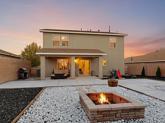 This 4 bedrooms, 2.5 baths home built in 2013 is nestled in the quiet Camino Crossing neighborhood of Rio Rancho. This flexible floorplan offers an additional flex room downstairs, perfect for an office or 5th bedroom, currently used as a formal dining area. The main level features a cozy living area and sizable kitchen with granite countertops, tile backsplash, stainless steel appliances, a kitchen island, plus pantry space! Upstairs you'll find the primary suite with a large walk in closet, double sinks and a full bath, along with 3 additional bedrooms-one of which is set up as a man cave- and a spacious loft that provides great living, work, or play space. The oversized backyard features a covered patio, built-in firepit, and water feature perfect for relaxing evenings or entertaining.