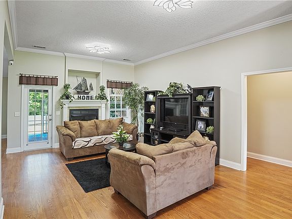 Step inside to an open-concept living area with a cozy gas log fireplace, formal dining space, and a huge eat-in kitchen that’s a true showstopper. Rich wood flooring flows throughout the main living areas, while the kitchen boasts gorgeous black granite countertops, breakfast bar, recessed lighting, and custom cabinetry—ideal for hosting and everyday living.