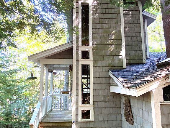 MAIN COTTAGE: Master bedroom has French doors to a private deck, spiral stairs lead to a tower bedroom, plus a third bedroom. Tiled shower in one full bathroom & a clawfoot tub in the second full bathroom, plus a sauna and separate tiled shower with a small dressing room on the lower level. Includes a small workshop and garage area used for storage (not a car). A roomy deck offers an outdoor dining option to a sunny dining room with cathedral ceiling and a pass-through to/from the kitchen. Heating options include a wood stove, a wood burning fireplace and an electric fireplace, plus a few electric baseboard heaters. Has electricity, a full septic system, and the water supply is pumped from the pond.