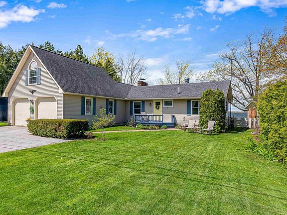 Year-round waterfront living with direct access to Lake Champlain! Enjoy the 70' of private lakefront access from this beautiful contemporary home. Updates include a brand new water softener system, insulation, and windows. Enjoy a large, modern kitchen with a breakfast bar and deck access. This space is open and includes a dedicated dining area with a large picture window, plus a charming brick hearth wood fireplace. Off the kitchen is a cozy bedroom. Moving through the home, find a bright living room with a vaulted ceiling and multiple skylights. From here, enter a stunning three-season room with wood detailing and updated windows. This space features tall ceilings and offers more water views and access to the back yard. Rounding out the main floor is an additional bedroom with a built-in Murphy bed and a full bathroom. Upstairs, a half-story has a private primary bedroom with an attached half-bath. This room features two closets, a seating area, and a large skylight window. Downstairs find a partially finished room for storage and enjoy the convenience of dedicated laundry room and a half bathroom. Outside, you’ll find a beautifully landscaped front entrance, with a large, flat lawn, porch, and attached 2-car garage. Then, head out back to the lake! Enjoy your large, shaded back deck, lawn, fire pit, and garden areas. Paved steps bring you down to the water, with safety fencing and both outdoor and shed storage for gear. Priced at April 2025 appraised value.