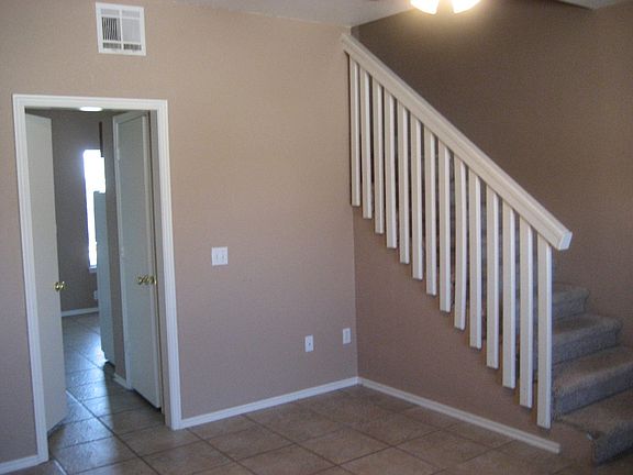 Stone flooring downstairsCarpeted upstairsOpen back patio