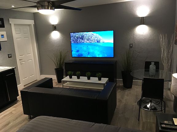 Studio apartment with modern finishes. Wood floors, bathroom with large walk in shower. Kitchen features solid wood cabinets, granite countertops, and stainless steel appliances. All utilities included, studio is fully furnished, with 65in Smart TV, plush couch, built in computer desk, computer chair, dresser, night stands, queen bed frame with pillow top mattress, and ceiling fan with remote. Recessed lights in the kitchen and bath. Double insulated windows with blackout drapes . Shared laundry room only steps away. Convenient Daytona Beach location only a few miles from ERAU, DSC, BCU, and all flight schools. NO Pets, NO Smoking, NO Slobs, NO Party People, and NO Drugs. $850 deposit, plus first month's rent to move in. Month by Month, move out anytime with 30 days notice, or one year lease available.