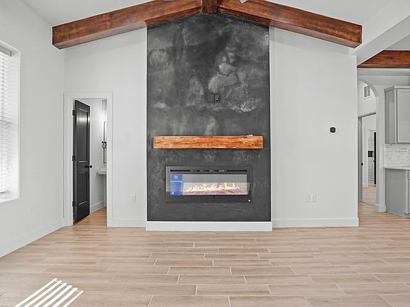 The light-filled interior boasts an open-concept living area with vaulted ceilings, exposed beams, and a cozy stone fireplace—perfect for relaxing or entertaining. The gourmet kitchen includes a large center island, farmhouse sink, shaker cabinetry, stainless steel appliances, and a walk-in pantry.