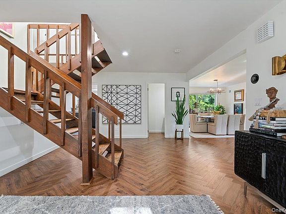 Contemporary Architect designed home complete with indoor pool, three-bedroom apartment, six bedrooms including an ensuite master bedroom with a walk-in closet. It was designed with high ceilings and windows in many rooms to provide natural light. Upon entering the front door you enter a large foyer with stairs to the second floor and a half bathroom straight ahead. The floor plan is open with high vaulted ceilings and windows close to the ceiling providing natural light, the open floor plan is ideal for entertaining. To the right is the living room and left is the formal dining room. The kitchen features modern appliances: a large French door stainless steel refrigerator, gas range, and electric ovens. Kitchen is open to family room with wood burning fireplace. Counter tops are black quartz with white veins. Parking is available in a two-car garage, on the driveway, and on an additional asphalt surface that accommodates six vehicles. The house is well maintained, with renovated bathrooms and kitchen (2021). On the second floor there is a foyer with lofty ceilings and windows and four large bedrooms including the master. The secondary bathroom is accessible via the hallway. At the end of the hallway there is a separate area with a private bedroom and ensuite bathroom. The garage is reached through a spacious second den with lofty ceilings, windows, and a half bath. Solar panels lower the electricity bill. The three-bedroom apartment has separate ingress and egress. The apartment also has high ceilings and upper windows that let in natural light. The kitchen is open to the living room and has room for dining.