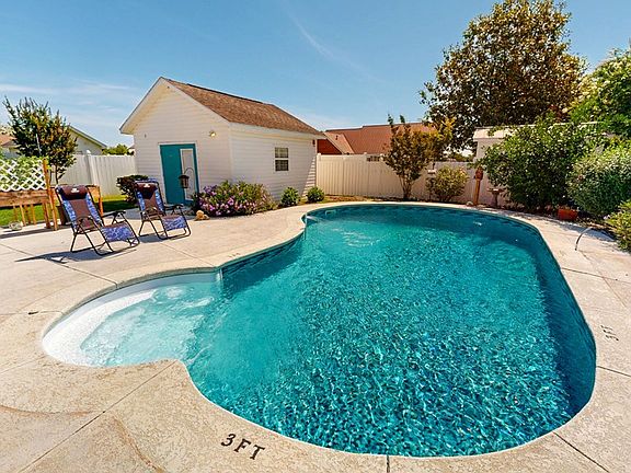 This home has it ALL in an affordable package! Start your staycation off in the backyard, your very own relaxing oasis. The pool is surrounded by plenty of patio space for lounging and outdoor furniture. Enjoy bug-free evenings from the screened porch at the back of the house. Tinker with your favorite hobby in the detached workshop. The fenced yard is private and lined with landscaping, including a satsuma tree! Inside, you'll find this home is full of upgrades! Features include high ceilings, upgraded light fixtures, wood and tiled floors throughout, NO CARPET! The living room opens off of the foyer, with built-in shelving for photos and knickknacks, and a gas fireplace. This kitchen has painted cabinetry with added pantry storage, attractive granite counters, tiled backsplash. The primary bedroom offers a deep closet and an ensuite bath with separate, updated vanities and an accessible shower. The driveway in front of the 2 car, attached garage is long and wide, providing plenty of parking space. The roof and pool liner have recently been replaced!
