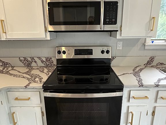 Large, open kitchen with eat-in space, quartz countertops, updated cabinets, and brand-new appliances (stove, fridge, microwave)