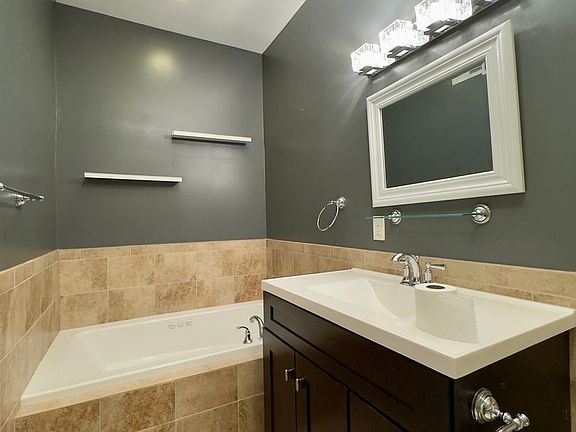 The home includes two full bathrooms. One is equipped with a soaking tub, a separate shower enclosure, tiled flooring, a lavatory counter, cabinet, and vanity mirror. The second bathroom features a walk in shower and similar high quality finishes.