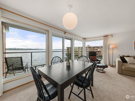Madison Park Waterfront! Bright south facing mid-century 2 bedroom, 2 bath, condo has big lake & Mt. Rainier views! Sweet unit with open floor plan, fireplace and balcony. Kitchen has been updated with new (2023) sub-zero refrigerator, (2022) induction stove, newer backsplash and faucet. Carpet was replaced in 2018 & water heater in 2019. Enjoy the convenience of living in a well managed building with modern amenities: swim dock, kayak launcher, fitness room, storage locker & 2 tandem covered parking spots. HOA dues include cable tv, internet, EQ insurance, water, sewer & garbage. Hallway & Lobby refresh to happen soon & seller will credit buyer $5000 for assessment. Ideal location near shops, restaurants, parks & bus stop.1 pet under 20#!