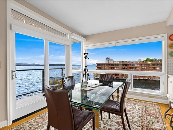 Stunning lakefront living in this exquisite Penthouse, end-unit condo perched above the serene waters of Lake Washington. You will feel as if you're floating over the lake, w/ 180-degree views that stretch from Mt. Rainier, the Cascades and the city of Bellevue. Floor-to-ceiling windows bathe every room in natural light, while the vaulted ceilings enhance the spaciousness of the living areas. The stunningly remodeled kitchen boasts marble countertops & new stainless steel appliances, perfect for the inner chef. Step outside to 2 spacious decks to savor the spectacular views. Enjoy 2 dedicated parking spots in a secure, gated parking lot. Enjoy a Community dock & a gym, making this a true sanctuary in the city. A short stroll to the Village.