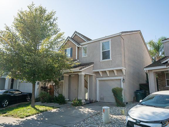 Sophisticated and thoughtfully designed, this 3-bedroom, 2.5-bath residence encompasses approximately 1,473 sq. ft. of living space on a 2,828 sq. ft. lot. The kitchen is appointed with timeless white tile countertops and stainless steel appliances, seamlessly connected to the main living areas enhanced by updated luxury vinyl plank flooring. Upstairs, all bedrooms are privately situated alongside a convenient laundry room. The primary suite offers a generous walk-in closet and a spa-inspired bath with dual vanities, a soaking tub, and a separate shower. The tandem garage is equipped with built-in shelving, a plumbing manifold, and a 220V outlet suitable for tools or EV charging. Additional features include a temperature-controlled attic fan and spare matching flooring and trim that will remain with the home. Outdoors, the backyard presents an inviting retreat with a patio, garden space, and an array of fruit trees including mandarin, lemon, orange, fig, and ponderosa. Ideally located within walking distance to Tanzanite Community Park, also just minutes from Costco and offers easy access to both I-5 and I-80, this home blends comfort, functionality, and charm.