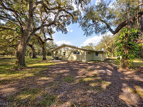 Explore this recently refreshed single-family home set on 2.18 acres in the serene rural community of Fort Denaud. The standout feature of this property is its magnificent mature oak trees, creating a picturesque scene reminiscent of a Southern Living magazine. At the rear of the property, you’ll find a 3-bedroom, 2-bathroom ranch home along with a detached workshop. Major upgrades including a metal roof, plumbing and impact windows all completed in 2017. As you approach the home, a covered carport and porch invite you to sit and relax with your morning coffee. The brick finish has been artistically painted to add a modern touch and enhance its appeal. Inside, you’re welcomed by new vinyl plank flooring. The kitchen features built in cabinets with plenty of counter top space. You even have beautiful view of the oaks from the sink that you’ll surely enjoy. Two dedicated living areas offer flexibility for designating a casual living space and/or a formal dining room. The larger living area features a wood-burning fireplace and built-in storage on either side. The primary bedroom is designed for comfort, featuring vinyl plank flooring, a large walk-in closet and beautiful views of the natural landscape. The dedicated laundry room provides ample space for your essentials. The two guest bedrooms share a bathroom equipped with a large vanity and shower/tub combo. For those with hobbies or storage needs, the 25’ x 35’ workshop is ideal for housing your tractor, toys and vehicles. It features a robust steel hoist system, perfect for working on your classic car. More than half of the workshop is enclosed, ensuring your belongings stay safe and protected from the outdoors. Additionally, a small creek runs along the back of the property, it was recently cleared for your enjoyment. Recent updates include new blow-in insulation in 2024 with a lifetime warranty, fresh interior and exterior paint in 2024, a new water heater in 2023, a well pump from 2019 and a new interior HVAC unit from 2020 with the exterior unit updated in 2018. Conveniently located just minutes to downtown Labelle. You can even enjoy a scenic drive to Ft. Myers daily down SR78. Paved access road. This home is ready for you to put your stamp on it. Don’t miss the chance to schedule a showing and experience the beauty of these magnificent oaks in person!