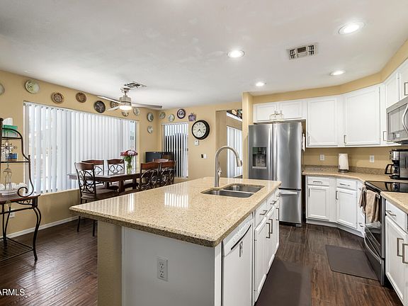 Discover this charming 4-bedroom, 2.5-bath residence in Superstition Springs Village! You're greeted by a welcoming great room with vaulted ceilings and a warm color palette. Vertical blinds are throughout the home for privacy. Wood-look porcelain tile is installed downstairs and in the 2 upstairs bathrooms. The kitchen, all bathrooms, and upstairs storage cabinet feature matching quartz countertops. Admire the newly renovated white kitchen cabinetry, recessed lighting, stainless steel appliances, dining nook, and island with breakfast bar. The family room offers a cozy fireplace for family gatherings and is open to the kitchen. Luxurious, upgraded carpeting upstairs is newly installed and super soft. New ceiling fans with remotes are in the family room, all bedrooms, and the the kitchen. The primary bedroom has vaulted ceilings with a