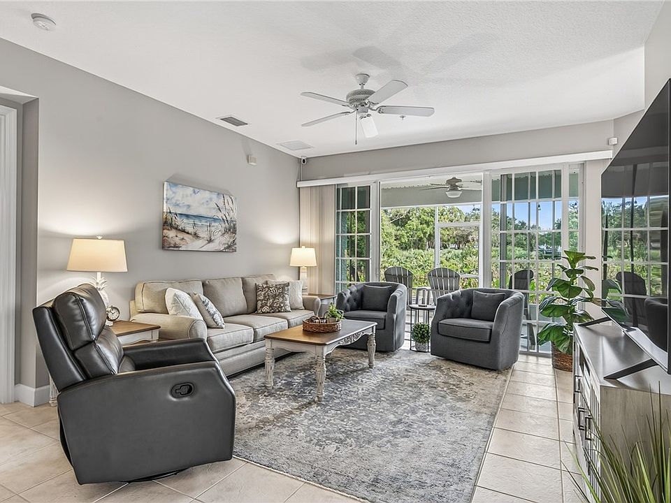 Fantastic first floor opportunity! Impeccable move - in ready corner unit loaded with sunshine as it faces south. Plenty of living space inc. screened porch w. golf view. Enjoy resort style living with amenities (pool, pickleball & fitness ctr) steps away. Spacious 2 car garage, impact glass, roof '23 & exterior paint '24, appliances – 2022,HVAC & WH -2020. Easy lock & leave.Two pet max.