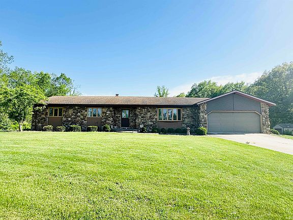 Beautiful, rolling, wooded, one owner home with 20 acres just east of Potato Creek State Park! You like privacy, nature, or like to hunt? This home sits way back off the road with breathtaking views! 1973 ranch that needs some cosmetic updating but is very solid and well kept. 4 large Bedrooms, 2.5 baths. Approx 2432 sqft. 2 fireplaces(one in the 12x20 enclosed screened porch with a hot tub, and access to the master BR). 1st floor laundry. Kitchen with an island. Large living room with a bay window. 2 car attached garage & attic storage. Full basement with poured walls. 4" well. 200 amp electric. Security system. Stone exterior. 14x36 outbuilding with concrete floor and electric. 23x40 pole-barn w/2 lean-tos(one enclosed12x40,9x40). Concord Grape Vineyard. Fruit trees. Just minutes south of South Bend. Rare to find these type of properties! Call today before it is gone!