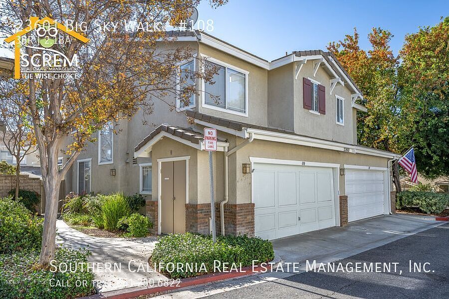 This beautiful three-bedroom townhouse is situated in the desirable Montana community in Valencia. Upon entering, you'll be greeted by an open floor plan. The living room boasts vaulted ceilings, carpet flooring, and a double-sided fireplace. Adjacent to the living room is the dining area, which includes a ceiling fan and leads into the kitchen. The kitchen is equipped with tile countertops, recessed lighting, a gas stove, a single oven, a microwave, a dishwasher, and a refrigerator. Next to the kitchen is the family room, which features a built-in entertainment niche, fireplace, carpet flooring, and a sliding glass door that opens to the private covered patio. The patio has a ceiling fan and a utility sink, perfect for outdoor gatherings. Additionally, there is a half bathroom located downstairs for guests. The spacious primary bedroom includes a vaulted ceiling, a ceiling fan, carpet flooring, a walk-in closet, and an attached bathroom with dual sinks and a walk-in shower. The two guest bedrooms also have ceiling fans, mirrored closet doors, and carpet flooring. The property features a full guest bathroom and an attached two-car garage that includes a full-size washer and dryer. Residents can enjoy the HOA amenities including a pool and spa. *The owner may consider a small pet.
