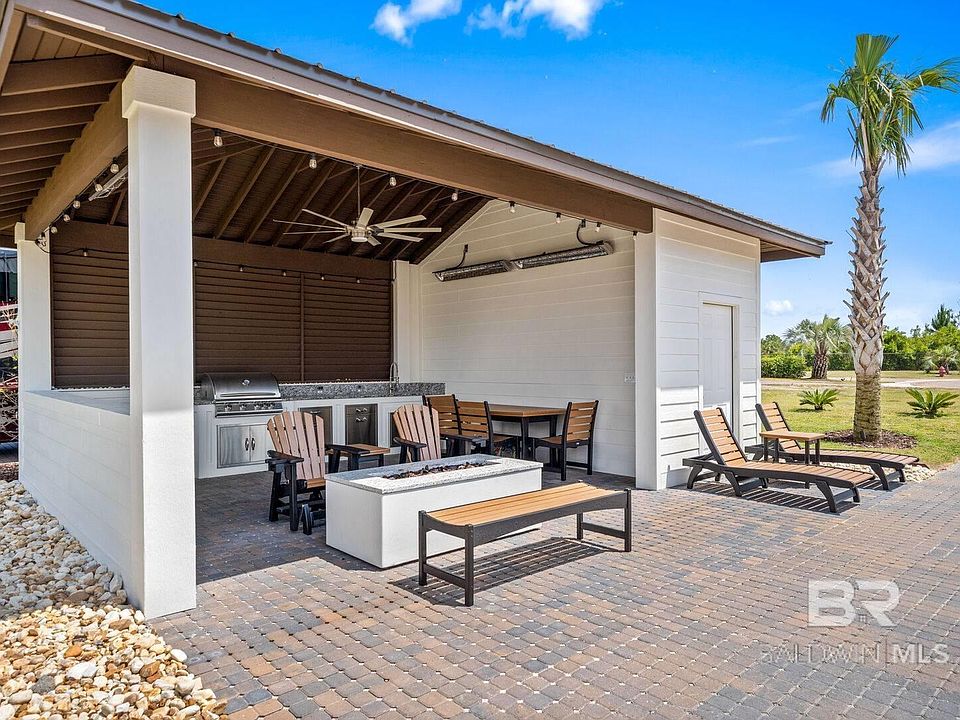 Partially covered fire featureTwo glidersOutdoor kitchenTwo chaise loungesSpacious table