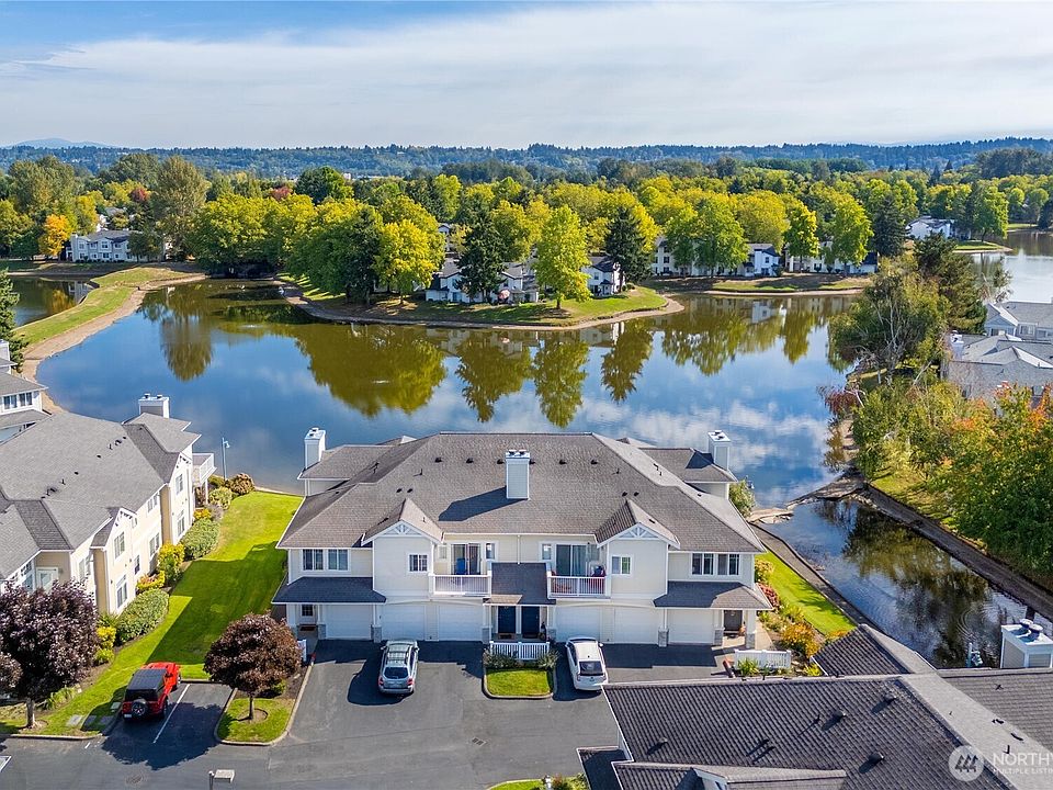 This beautiful condo in West Bay at Lakes offers 800 SqFt of comfortable living with vaulted ceilings, laminate hardwoods, and a cozy wood-burning fireplace. The open layout includes a spacious kitchen with all appliances, dining space, and a living room that flows to a private balcony. Retreat to the large bedroom with walk-in closet and soaking tub. Unit features include updates throughout, in-unit laundry, and a private garage with additional off-street parking. Community amenities include a clubhouse, fitness room, sauna, trails, and beautifully maintained grounds. HOA covers water, sewer, lawn care, and much more. Convenient Kent location near transit, parks, and shopping.