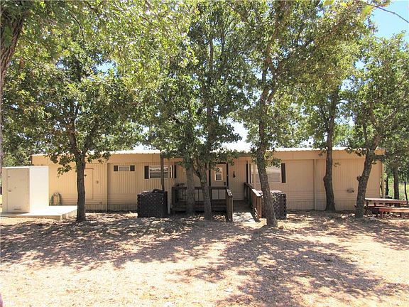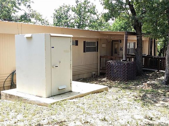 It's a gorgeous view of Lake Brownwood from this well maintained mountainside retreat! 3 bed-1.5 bath MH with a vintage camper guest house. Large windows across the living room and a nice balcony provide amazing views of the lake and skyline. Large rocks and beautiful Oak trees naturally landscape this charming lake home. Outside features a CAT5 storm shelter, water catchment system, vehicle awning, RV awning, 3 sided awning and outdoor fire pit. It's an older mobile home that was fully remodeled around yr 2000. The vintage camper is charming and would be fun to restore. Park your RV or 5th wheel under the tall RV awning for additional guests or protected storage.